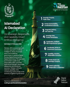 During the Summit, the Minister formally unveiled the Islamabad AI Declaration, articulating Pakistan’s position on sovereign, inclusive, and responsible artificial intelligence. The Declaration outlines eight strategic pillars covering public value, human accountability, pragmatic use-case delivery, data privacy and trust, safe and explainable AI, whole-of-government governance, inclusive innovation, and a private-sector-led AI ecosystem.